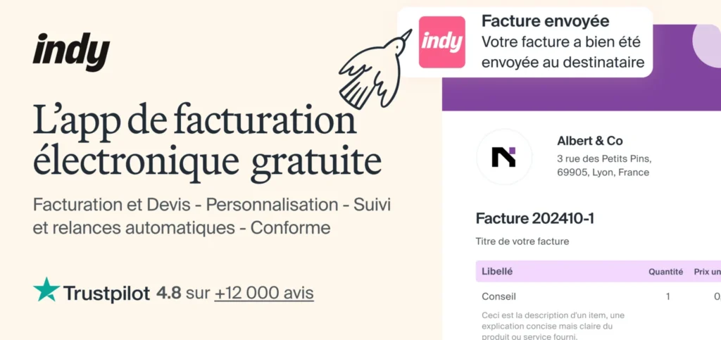Indy est officiellement certifiée par l’administration fiscale française pour émettre et recevoir des factures électroniques et propose un module de facturation complet, inclus dans l’offre gratuite :